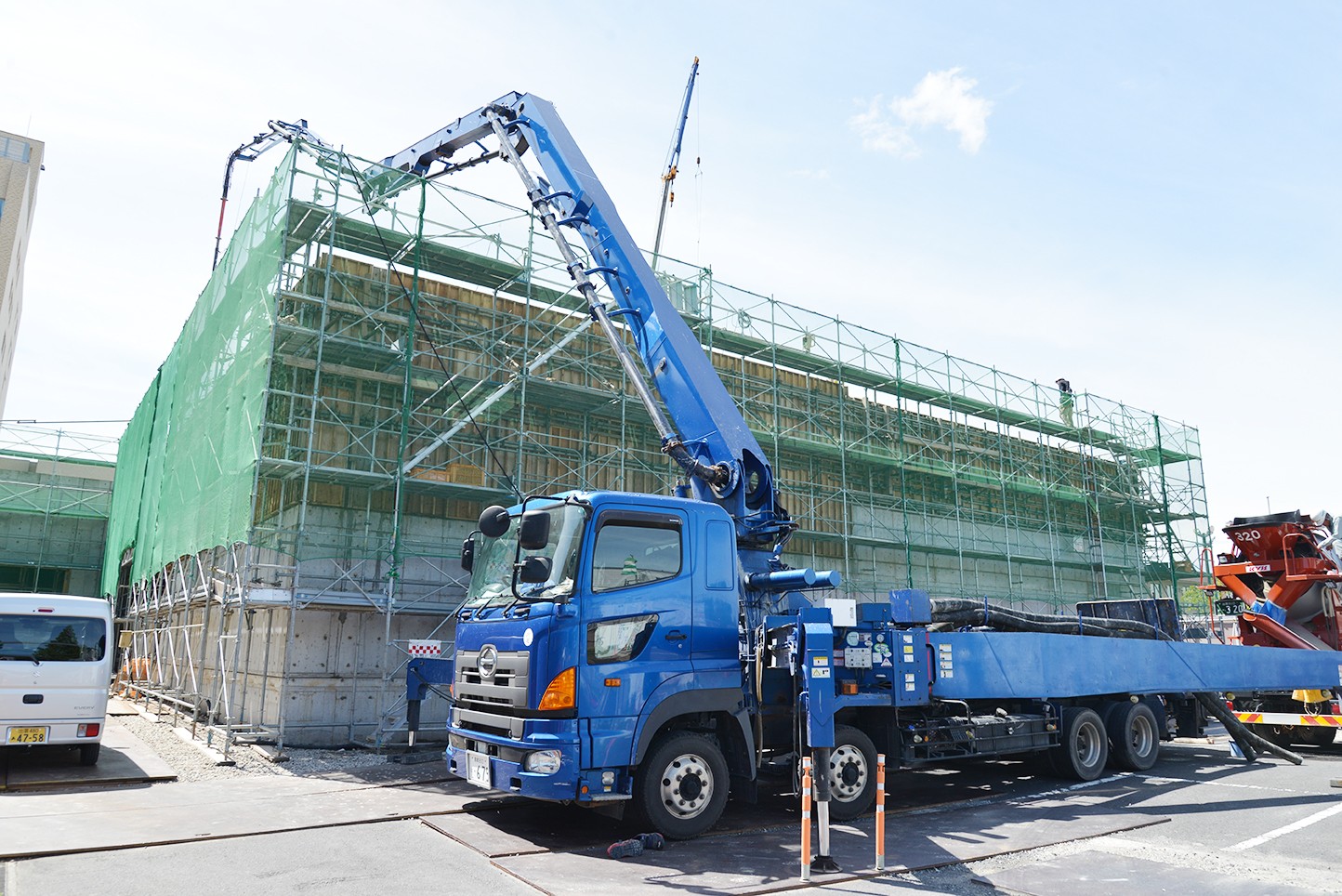 コンクリート工事とは、コンクリートポンプ車で生コンクリートを枠の中に流し込み、コンクリートで建物を作っていく仕事です。建設物の築造に最も欠かせない、最重要な工種がコンクリート工事です。