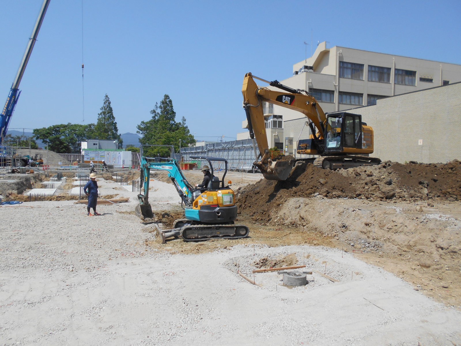 目立つ仕事ではないかも知れませんが、繊細で重要度の高い工事です。自然との闘いも多く、建設工程の中でも、最も計画性に変更が出やすい工事ではありますが、安全でそして遅れなく、正確な基礎が完成したときは、それだけで現場全体の流れに勢いがつき、現場作業員全員の雰囲気も明るくなります。そして私たちの仕事を土台として、その上に大きな建物が徐々に建っていく様子を見ていると、なんだか嬉しく、やりがいを感じることができます。