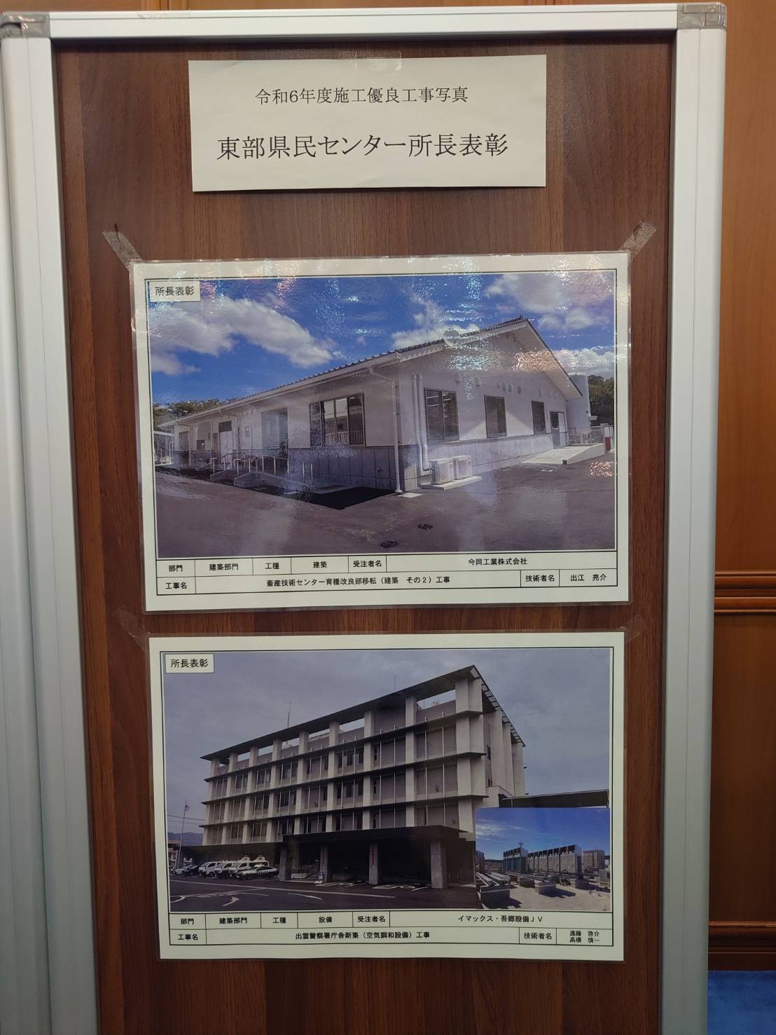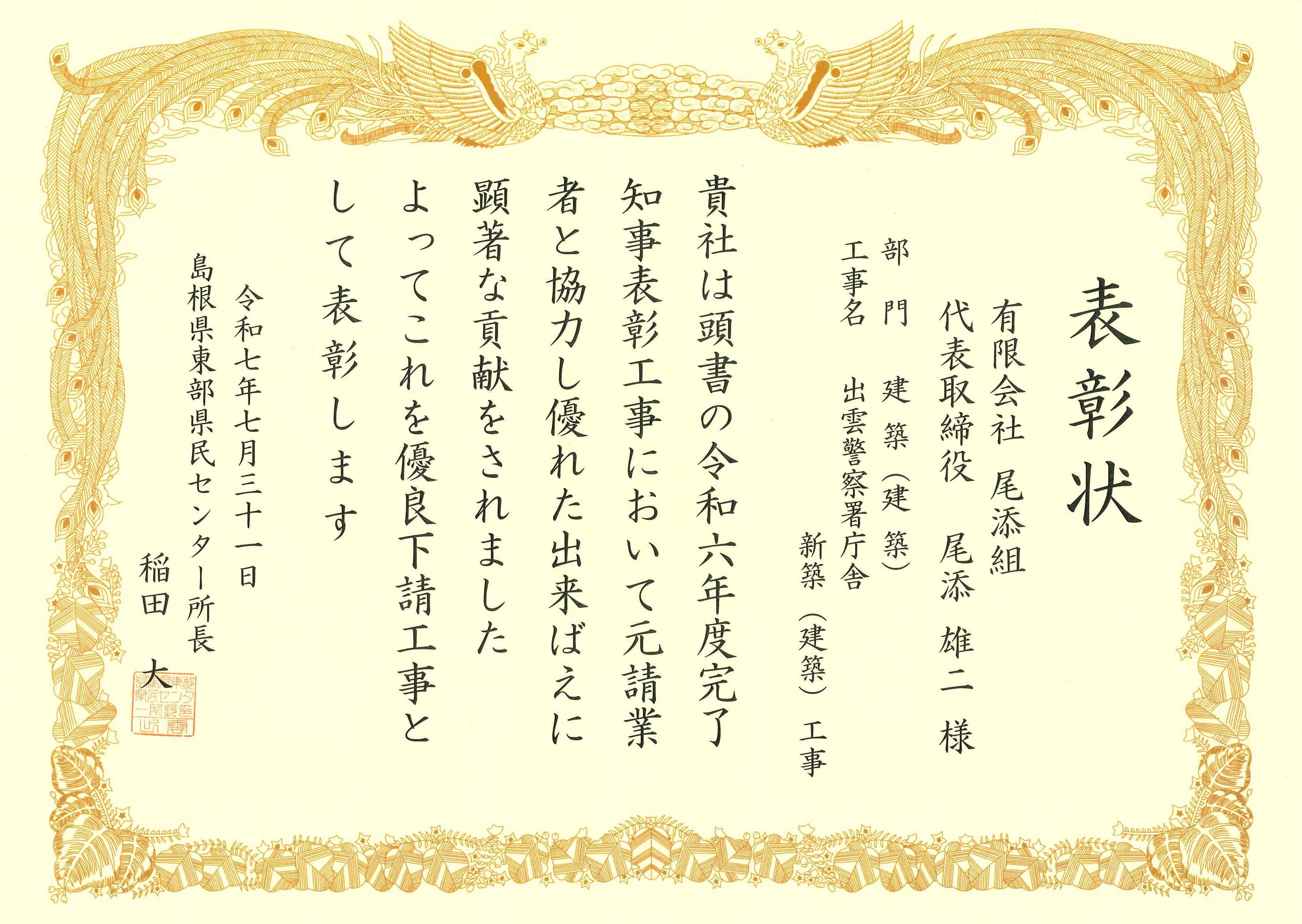島根県優良工事等所長表彰 2025.08.01 お知らせ 出雲警察署庁舎新築(建築)工事において 東部県民センター所長表彰『優良下請工事表彰』を受賞いたしました 工事関係者の皆さまには 工事期間中、多数のご指導を賜り本当にありがとうございました 社員一同、安全と品質をさらに追及し、恩返しができるように邁進してまいります 引続きよろしくお願いいたします 一覧に戻る